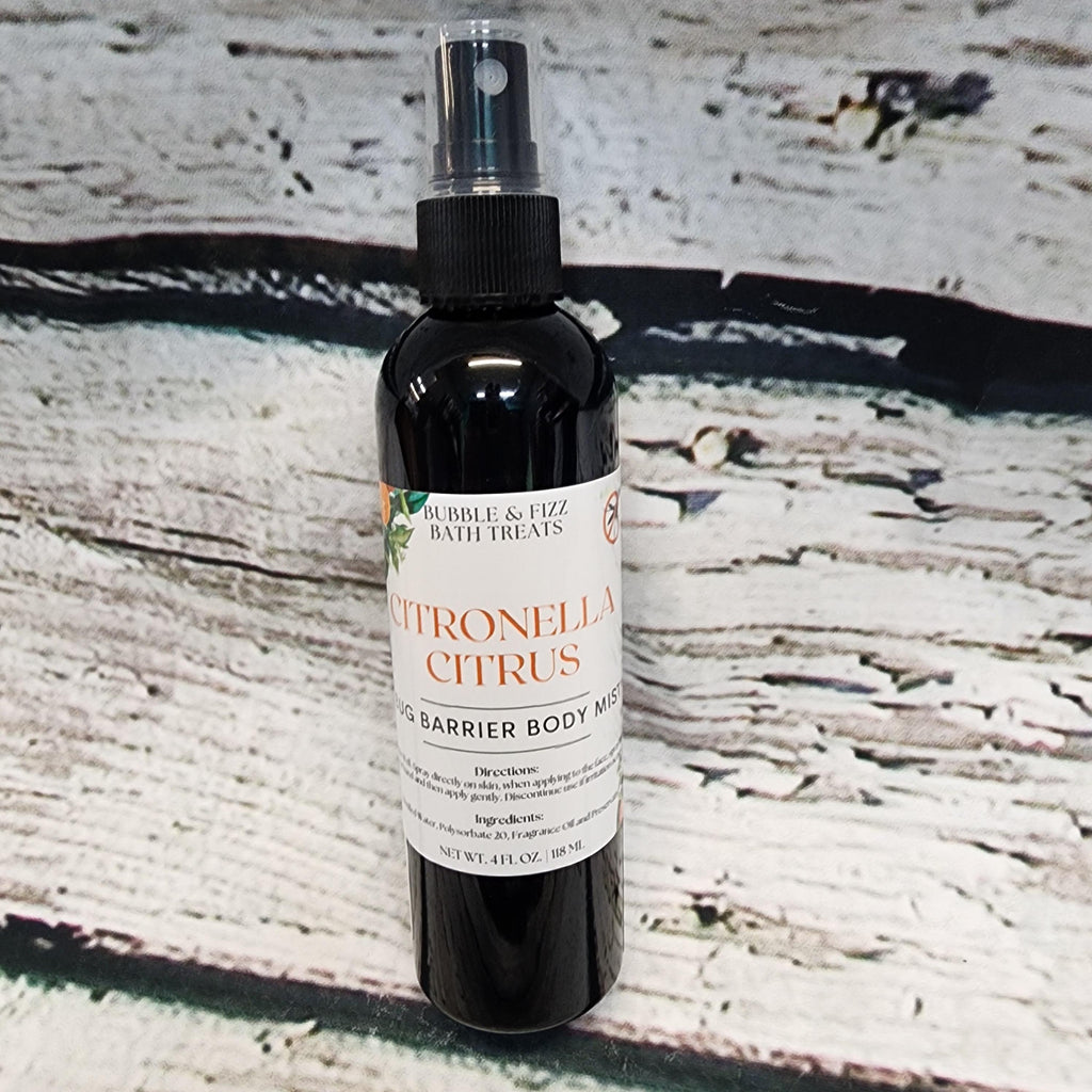 Say goodbye to pesky bugs with our bug barrier body mist! This powerful spray keeps insects at bay, giving you peace of mind as you enjoy the great outdoors. Made with sensitive skin in mind and great for all ages! Net wt 4 fl oz. Ingredients-distilled water, polysorbate 20, fragrance oil, and germall plus warnings: for external use only. Avoid contact with eyes. Do not store in direct sunlight. Patch test me first and do not use if irritation occurs. Store in a cool dry place. Bubble & fizz bath treats llc is not responsible for mis-use of our products.