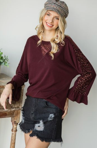 3/4 sleeves top with animal velvet mesh contrast detail and stitching neckline with mini bell sleeves, fabric is made in korea 62% polyester 34% rayon 4% spandex, 68% polyester 24% rayon 8% spandex made in usa