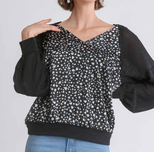 Animal Knit Woven Print Long Sleeve Top