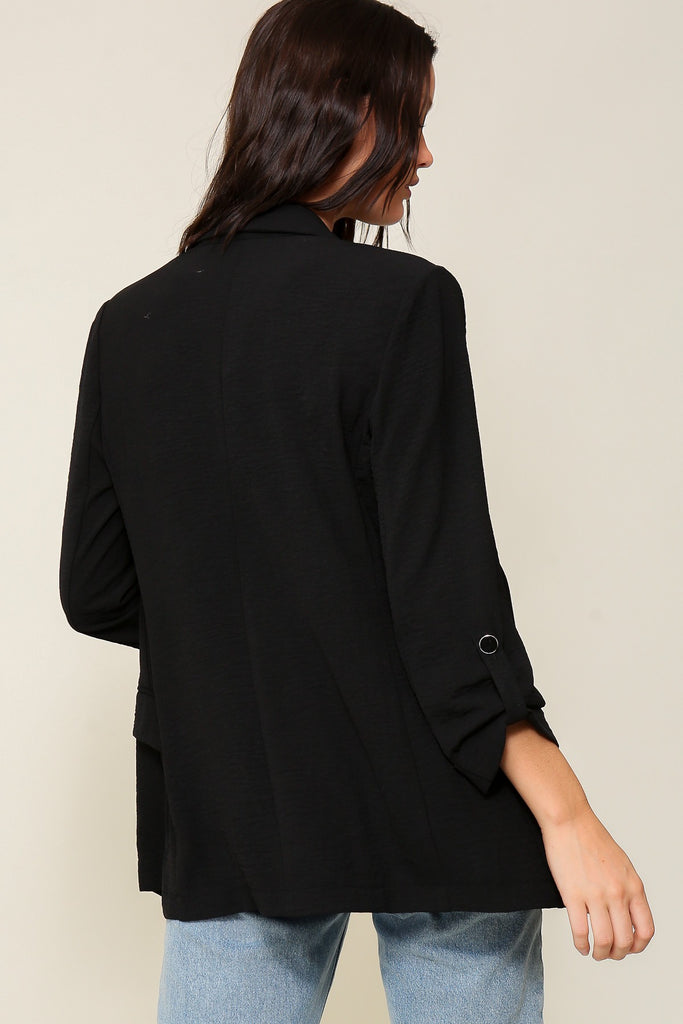 An oversized blazer crafted from the divine brooklyn airflow fabric, featuring a whimsical 3/4 rollup sleeve design with a touch of allure. Its shoulder is exquisitely padded, adding a dash of sophistication to your ensemble. Delightfully, it comes adorned with front pockets that ooze functionality and style.