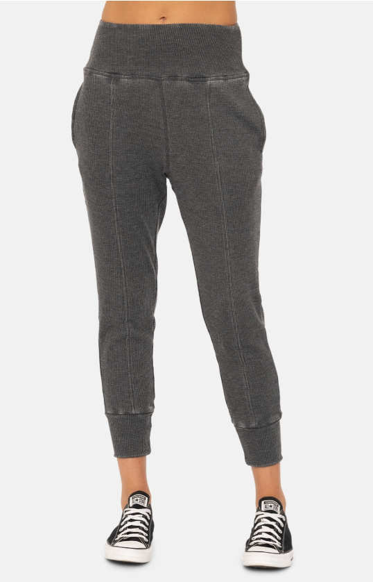 Combine practicality with laid-back chic. Our cotton blend joggers are crafted from our best-selling waffle knit fabric and designed with a relaxed drop crotch fit and trendy cropped leg length. Perfect for casual wear or lounging, the princess seams down the legs create a flattering silhouette, while the mineral wash effect adds a unique, lived-in look. Conveniently store your essentials in the inseam pockets. Logan is 5'9", a size 2, and is wearing an s 60% cotton 40% polyester