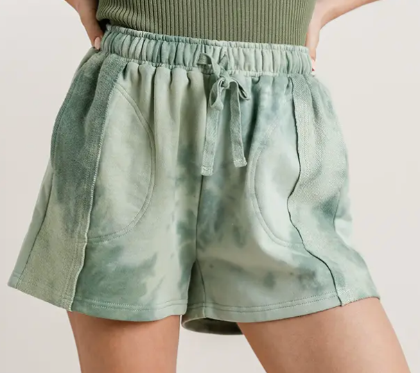 French terry tie dye elastic waist and drawstring inside out french terry shorts with pockets fit & model notes: • model is 5'8" and is wearing a small. • all measurements are approximate. Fabric contents: • 100% cotton