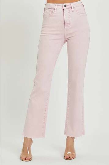 High rise raw hem slit straight pants - rise 11" | inseam 29" in size 3/26 - model info: height 5'8" | waist 24" | hips 34" - model is wearing size 1 *due to the nature of acid denim dyes, each denim color may look different. Fabric contents 98% cotton, 2% spandex