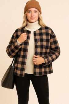 Stay cozy and stylish all season long in this plaid sherpa jacket. Crafted from ultra-soft sherpa fabric, this jacket features a button-front closure, relaxed fit, and a classic black-and-tan plaid pattern that adds a timeless touch. Designed without a collar for a clean, modern look, it's the perfect layering piece for chilly fall and winter days.