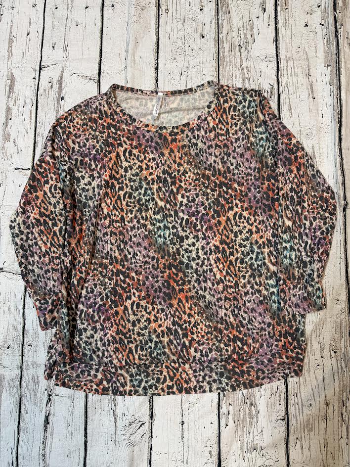 We love our weekender top with fun prints! This pullover features round neck band with banded sleeve and hem. Easy fit, knit, non sheer. Fabric content 65% polyester 32% rayon 3% spandex