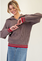 Zipper front knit sweater pullover -half zip front -wing collar neckline -dropped shoulders -ribbed and striped cuffs and hem -relaxed and loose fit -small measurements : length - 24.5" & bust - 19" & sleeve - 23.75"