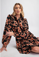 Floral printed sophia woven button front dress -long sleeves -collared neckline -button front closure -bishop sleeves -rounded hem -adjustable tie on waist -floral print detailing -perfect for fall dresses
