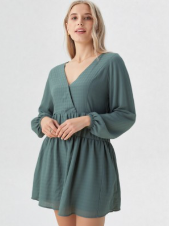 - textured woven mini dress w/ back tie - overlap v-neck - long dolman sleeve - tired & shirring detail