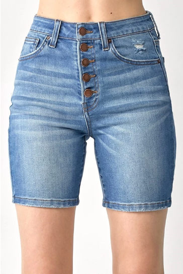 High rise button fly mid-thigh shorts - rise 11.25" | inseam 6.5" in size s - model info: height 5'7" | waist 24" | hip 35" fabric contents 95% cotton, 4% polyester, 1% spandex