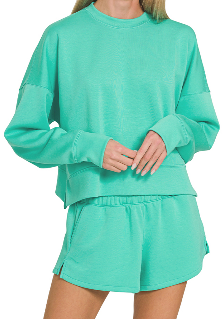 Scuba long sleeve sweatshirts & shorts set -elastic waistband shorts with side pockets ** top total body length: 20.5", bust: 48" approx. - measured from small ** shorts total waist: 27.5", inseam: 2.5" approx. - measured from small ** color may vary slightly due to monitor resolution - 50%polyester, 45%rayon, 5%spandex