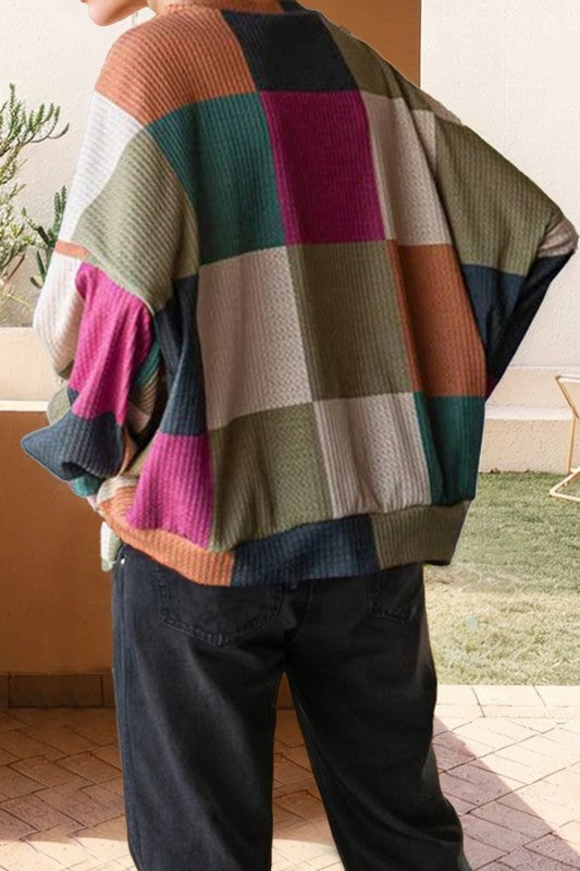 Checkered Print Textured Knit Long Sleeve Top