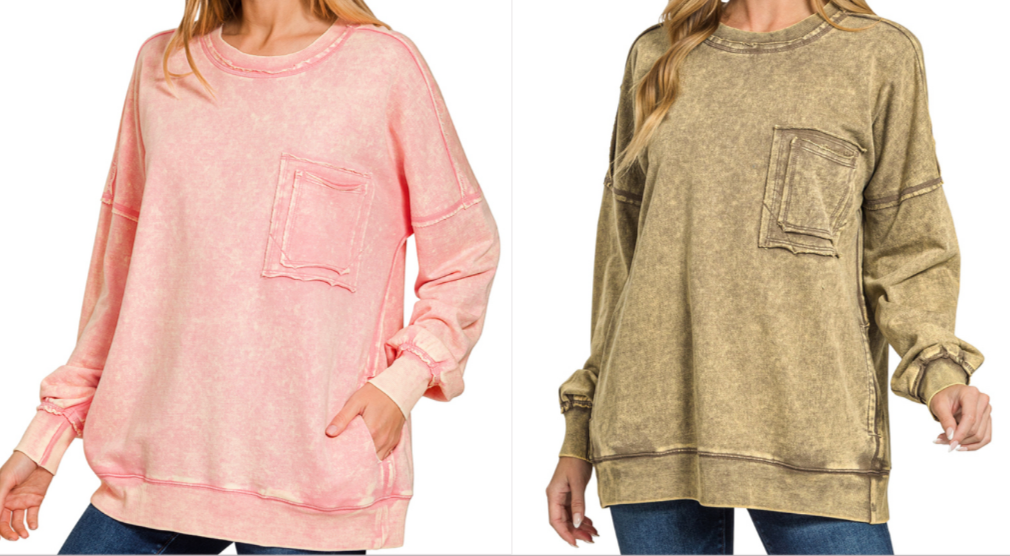 F/terry Acid Wash Raw Edge Front Pocket Pullover