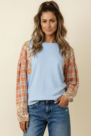 Round neck bubble long sleeve solid french terry floral print plaid woven color block pullover knit top