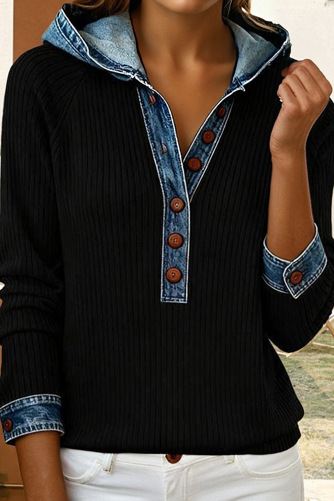 Hoodie Long Sleeve Denim Trim Button Front Top