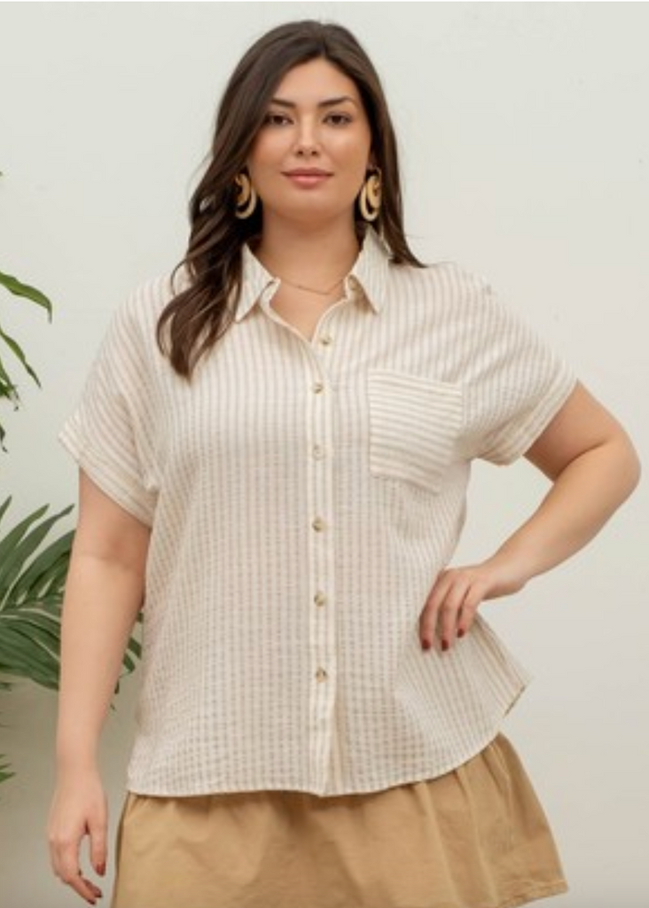 Collared button up pocket roll up sleeve detail striped linen blend woven top 32%linen, 32%rayon, 25%cotton, 11%polyester